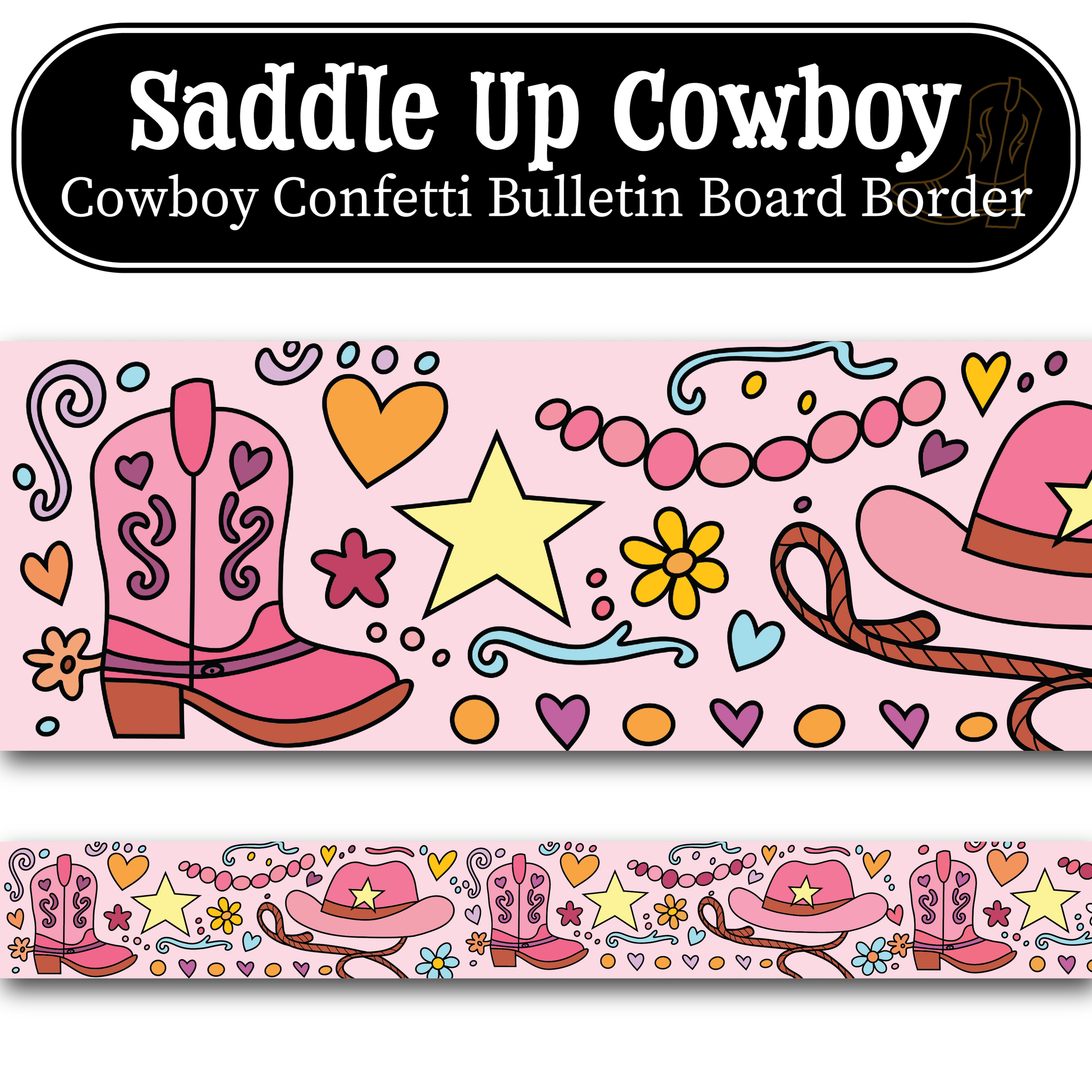 Yeehaw meets celebration in our Cowboy Confetti Bulletin Board Border! Bursting with cowboy boots, ropes, stars, hearts, beads, and all things western, this playful design brings a party to your bulletin boards. It’s the perfect mix of wild west and whimsical fun — like a hoedown for your classroom walls.